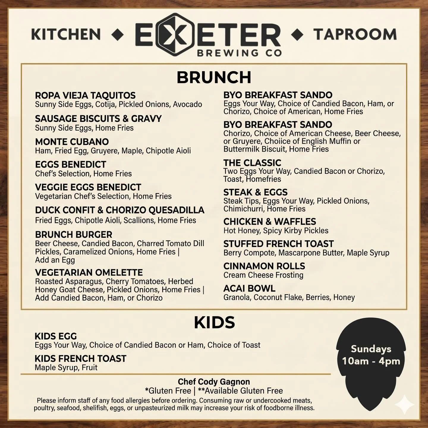 Hours: Mon - Thu 4-9pm, Friday/Saturday 11:30-9pm, Sunday Brunch 10-4pm